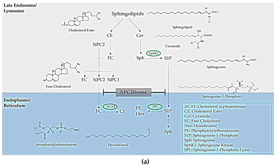 In the functional lysosome, lipids and other macromolecules, such as carbohydrates, peptides, and nucleic acids, are degraded through the action of acid hydrolases. Inherited defects in genes that encode lysosomal enzymes and non-enzymatic proteins can cause the build-up macromolecules within the late endocytic system []. The ‘umbrella’ term for these diseases is lysosomal storage disorders (LSDs), a classification that can be further sub-categorised into lipid storage disorders (lipidoses), mucopolysaccharidoses, glycoprotein storage disorders and mucolipidoses. The lipidoses are the focus of this review, and are listed in Table 1, together with their corresponding defective genes encoding the specific enzyme/protein which is depleted or malfunctional. Table 1 provides detailed information regarding treatment options, including enzyme replacement therapy (ERT), which is used to remove the accumulation of the respective lipids by enzymatic processes; substrate reduction therapy (SRT), which is employed to remove the accumulation of the respective lipids by the use of a drug or binding molecule; chaperone therapy, which aims to ‘scaffold’ the protein so it is no longer unfolded and functions appropriately; and finally, haematopoietic stem cell therapy, which involves the implantation of stem cells. Niemann-Pick disease type C (NPC) is caused by mutations in two genes NPC1 (95% of clinical cases) and NPC2 and exhibits storage of multiple sphingolipids and cholesterol. The lysosomal storage of sphingosine in NPC gives rise to a loss of lysosomal calcium ions, a process accompanied by the accumulation of unesterified cholesterol and glycosphingolipids [,]. NPC1 encodes a large trans membrane protein that resides in the limiting membrane of the lysosome and is termed NPC1 protein []. NPC2 encodes a small soluble lysosomal protein that binds cholesterol within the lysosomal lumen, and which is believed to transfer cholesterol to the NPC1 protein. Full details concerning how such proteins may complement each other to permit cholesterol passage through the glycocalyx and the lysosomal membrane are available in []. Figure 1a shows how NPC disease impacts on the trafficking of lipids, whereas Figure 1b shows mechanistic schemes depicting the pathogenesis of a series of other lipidoses which arise from of enzymatic defects, unlike trafficking disorders as in NPC disease.