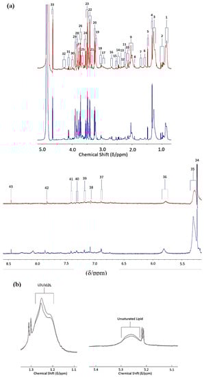 Recently, our group performed a pilot investigation using a conventional 1H NMR-based metabolomics approach. This previously unpublished pilot study was conducted in order to identify new, potentially valuable biomarkers for GM1 Type II gangliosidosis, particularly those which correlated with severity and progression. Plasma samples were collected from patients with GM1 Type II Gangliosidosis (n = 10) and control participants (n = 28) with mean ages of 11 ± 2.3 and 22 ± 0.7 years, respectively (Figure 1). More than 40 metabolites were detectable in these spectra, including a range of biomolecules such as short-chain organic acid anions (e.g., acetate, formate, fumarate, lactate, pyruvate, succinate, glycolate and 3-D-hydroxybutrate); the BCAAs leucine, isoleucine and valine; other amino acids including glycine, alanine, glutamate, glutamine, lysine, proline, taurine, histidine, phenylalanine and tyrosine, etc., together with N-acetylamino acids; carbohydrates, most especially GM1 disease-relevant N-acetylsugars; and nicotinate and nicotinamide pathway metabolites, among others. Typical spectra acquired are shown in Figure 2a. Average spectral intensity profiles, which show significant differences in lipoprotein-associated triacylglycerol concentrations between the two phenotypes, are depicted in Figure 2b. 1H NMR spectra therefore clearly reveal disturbances in lipid metabolism, a common feature of LSDs.