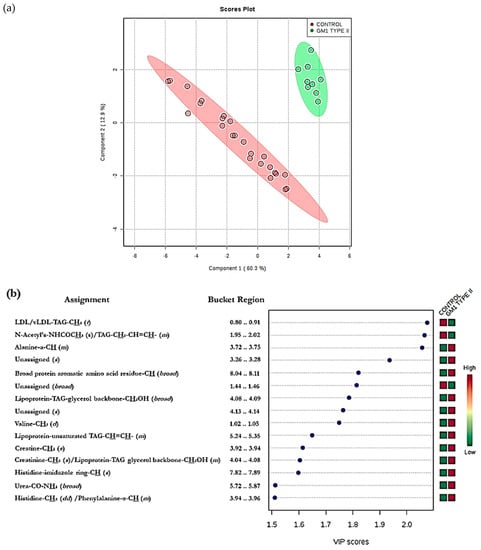MV metabolomics analysis using 1H NMR data by PLS-DA revealed a clear distinction between the two disease classification groups (i.e., GM1 type II (juvenile onset) gangliosidosis versus. healthy controls, (Figure 3)). Permutation testing demonstrated a high level of discrimination between these two classifications (p = 0.0015). Variable importance parameter (VIP) values also confirmed a high level of significant differences between many of the 1H NMR intelligently selected bucket (ISB) variables; for example, downregulated lipoprotein-associated triacylglycerols in the GM1 type II gangliosidosis patients, observations which indicate overall perturbances in lipid metabolism in this disease (Figure 2).