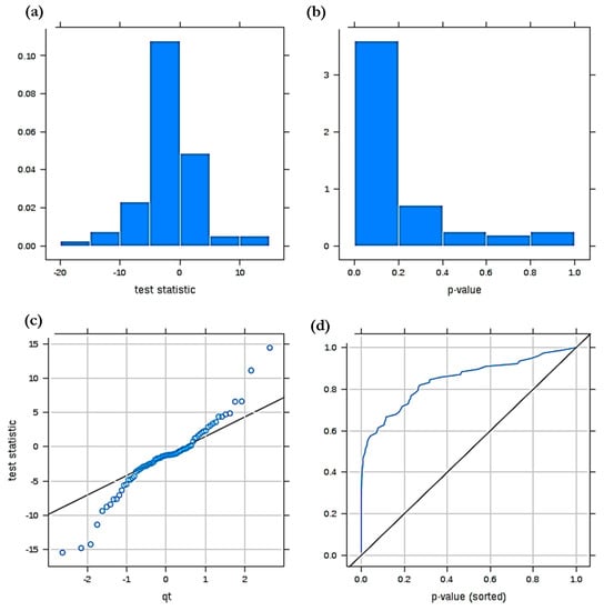 Diagnostic plots derived from a MV statistical power calculation conducted on a model involving comparisons between the 1H NMR profiles of human blood plasma collected from healthy humans (controls) and GM1 type II gangliosidosis patients. (a) t statistic value p value distribution displayed as a histogram; (b) corresponding QQ plot of these t-test values (i.e., t versus qt value); (c) left-shifted distribution of t-test statistic p values for this power analysis; (d) plot of sorted t statistic p values versus their ranking. The dataset was constant-sum normalised, cube root-transformed and Pareto-scaled prior to analysis.