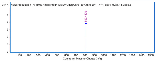 The isolation of astragaloside IV from aqueous methanolic extract of the roots was performed by semi-preparative HPLC chromatography. For this purpose, 52 fractions were collected in a single-cycle separation process. The compositions of the obtained fractions were analyzed using high performance liquid chromatography, coupled with mass spectrometry (HPLC-MS) to provide high-resolution qualitative data. The analysis confirmed the presence of high purity astragaloside IV in the tested fractions (