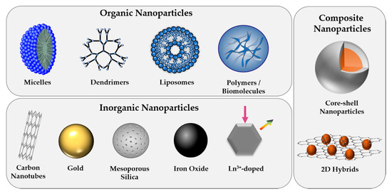Increasing know-how and continuous progress in engineering materials at the nanoscale with tunable physicochemical properties has led to the indispensable implementation of NPs in various fields of our everyday life, including the medical sector. With the potential to revolutionize our current treatment and visualization of various diseases, including cancers, NPs have not only been developed for biosensing and bioimaging to allow for early detection of dysfunctional cellular pathways but also for therapeutic purposes [27,28]. The controlled killing of diseased cells is commonly performed through the application of heat (photothermal therapy, hyperthermia), ultrasound, radiation, activation of reactive oxygen species (photodynamic therapy), gene and immune-modulation, the delivery of high payloads of drug molecules, or combinations thereof [29]. Based on their high active surface area compared to their small volume, NPs do not only serve as excellent carriers for therapeutic (bio)molecules but, depending on the composition, often possess inherent features that allow for their intracellular tracking or therapeutic use. Engineered NPs that have been designed for biomedical applications comprise a broad range of material classes, including organic, inorganic, and more complex composite structures (Figure 1) [30]. This chapter is intended to give a brief overview of the most commonly employed NP types and to highlight their outstanding characteristics.