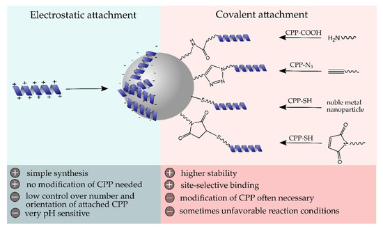Nevertheless, the interplay between CPPs and NPs is highly complex, and the choice of the conjugation method plays a pivotal role, leading to highly efficient intracellular vectors or in contrast to impairment of peptide functionality. Based on our experience, we believe that understanding this chemical interaction, the stability of formed bonds and their influence on potential changes in physicochemical properties of CPPs and NPs are essential to developing conjugates that possess high cell internalization efficiencies and biocompatibilities, requisites that are needed for their successful translation into clinics. Therefore, within this current work, we attempted to highlight recent progress made in the employed conjugation mechanisms of CPP-NP conjugates, discussing their advantages and disadvantages and potentially useful techniques for the characterization of resulting physicochemical properties. Moreover, we have updated the field of biomedical applications of CPP-NP conjugates in cancer medicine with approaches that were performed during the last two years to depict the current state of the art.