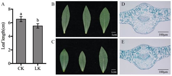 Morphological and microstructural characteristics of alligator weed leaves under different potassium conditions. Note (A) statistical results of leaf length; (B) leaves from CK; (C) leaves from LK; (D) leaf microstructure under CK conditions; (E) leaf microstructure under LK conditions. Values are the mean ± SD (n = 3), and different letters indicate significant differences (p < 0.05) between the treatments, CK indicates control, LK indicates potassium deficiency.