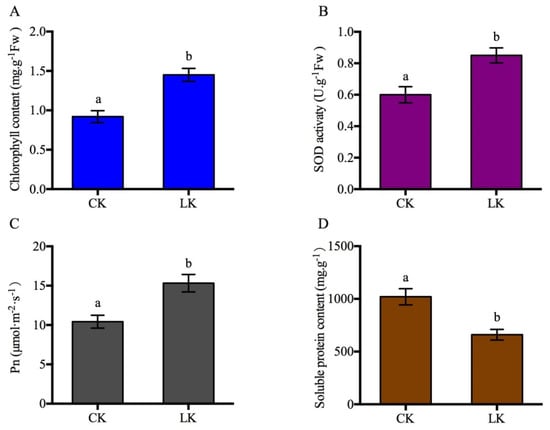 Leaf physiological parameters were analyzed. Note (A) total chlorophyll content; (B) SOD activity; (C) net photosynthetic rate; (D) soluble protein content. Values are the mean ± SD (n = 3), and different letters indicate significant differences (p < 0.05) between the treatments, CK indicates control, LK indicates potassium deficiency.
