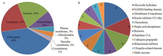 We employed tandem mass tags (TMT) and liquid chromatograph-mass spectromete(LC–MS/MS) to characterize the proteomic profiles of the leaves. The proteomic data showed that LK dramatically changed the protein abundance in the leaves. A change of more than 1.2-fold or a cut-off of less than 0.83-fold (p < 0.05) was considered statistically significant. Among quantifiable proteins, a total of 119 proteins were regarded as differentially abundant proteins (DAPs). Among these proteins, 63 were up-regulated, and 56 were down-regulated (Table S1). The subcellular locations of 119 DAPs were predicted by Target P1.1 software. The results suggested that 47 proteins showed chloroplast localization, of which 21 were increased; 25 proteins showed cytoplasm localization, of which 15 were increased; and 24 proteins showed nucleus localization, of which 14 were increased; these proteins constituted the top three groups. Localization in the plasma membrane, mitochondrion, vacuolar membrane, and cytoskeleton was the lowest, with protein numbers of 4, 4, 2, and 1, respectively (Figure 3A). According to the protein domain analysis, the top three protein groups were glycoside hydrolases, NAD(P)-binding domain-containing proteins, and glutathione S-transferases, of which 9, 6, and 6 were mapped, respectively, and the next 4 Kunitz inhibitor ST1-like proteins were all down-regulated (Figure 3B).