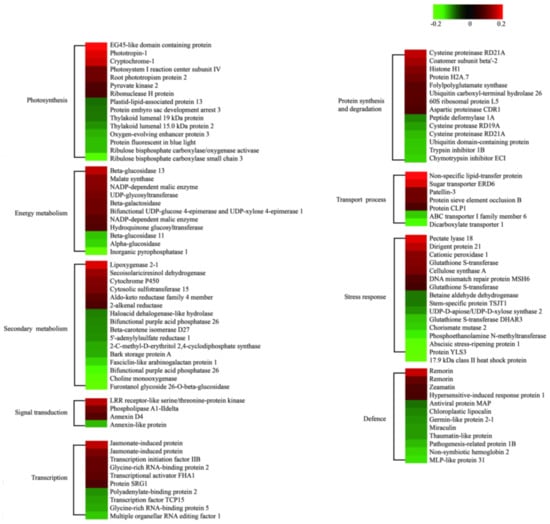 All DAPs were annotated and classified according to their biological process (BP), molecular function (MF), and cellular component (CC) according to the Gene Ontology (GO) database. The primary categories of BP were metabolic processes, single-organism processes, and cellular processes; the most abundant categories of CC were membrane, macromolecular complex, and cell, and the prominent MF categories were catalytic activity, binding, and molecular function regulator (Figure S1). The biological metabolic pathways related to the 119 DAPs were subsequently investigated using Kyoto Encyclopedia of Genes and Genomes (KEGG) analysis. The results suggested that most represented DAPs were associated with secondary metabolism and the stress response (both were associated with 16 DAPs), photosynthesis (15 DAPs), and protein synthesis and degradation (14 DAPs), while the fourth and fifth categories were associated with defense pathways and energy metabolism, respectively; each group included 12 to 11 DAPs (Figure 4).