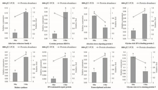 Six DAPs were chosen for quantification by PRM–MS analysis to verify the proteomic results (Table 1). As this assay required the signature peptide of the target protein to be unique, we selected only proteins with a unique signature peptide sequence for the PRM analysis. Six DAPs were identified in the leaves: malate synthase, cysteine proteinase RD19A, betaine aldehyde dehydrogenase, antiviral protein MAP, major latex protein 31, and choline monooxygenase. In general, the fold changes of these detected proteins were in agreement with the findings of the proteomic analysis. Our PRM analysis illustrated that the proteomic results were credible for subsequent analysis. A total of eight proteins were randomly selected to complement the accuracy of the proteomic data via qRT-PCR. There were seven gene expression patterns that showed the same tendencies as those of the expressed proteins: aldo-keto reductase family 4, abscisic stress-ripening protein 1, glycine-rich RNA-binding protein 2, malate synthase, DNA mismatch repair protein, transcriptional activator, and glycine-rich RNA-binding protein 5. Only one cysteine protease, RD19A, showed an opposite expression pattern (Figure 5).
