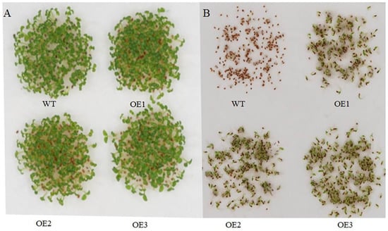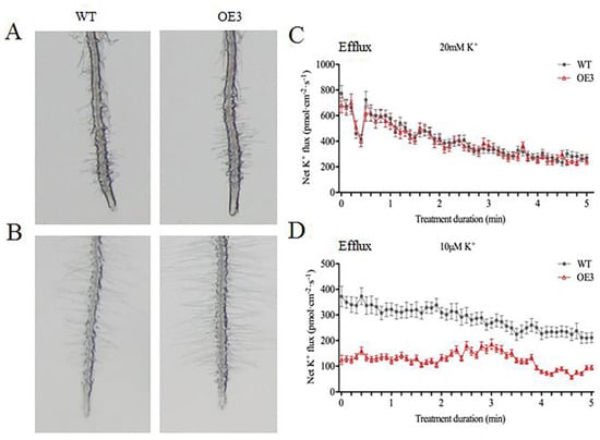In Arabidopsis, overexpressing POD can improve AtHAK5 expression in response to LK stress []. Proteomic analysis suggested only one cationic peroxidase 1 (ApCPX1) increased in abundance in the leaves after LK treatment in our study; we then cloned this gene and overexpressed it in tobacco to determine its function in LK stress. Additional research suggested the expression level of ApCPX1 in three transgenic tobacco lines was higher than that of non-transgenic tobacco (WT) (Figure S2), and the germination rate of the transgenic tobacco seeds (OE1, OE2, OE3) was similar in the WT and the three transgenic lines under normal growth conditions (Figure 6A); however, the germination rate of the transgenic lines was obviously higher than that of the WT after 10 days of LK treatment (Figure 6B). Further results suggested that the seed germination rate, POD activity, and K+ content all increased (Figure 7A–C), while the H2O2 content decreased in the three transgenic tobacco lines compared with the WT under LK stress (Figure 7D). The observation experiment of root hair showed that there was no difference in the number of root hairs between the WT and transgenic tobacco OE3 line growing on MS medium for 10 d, but the root hairs of the OE3 line were significantly higher in number than WT after LK treatment (Figure 8A,B). Next, further research showed net K flux rates in roots between WT and the OE3 line were similar under 20 mM K external conditions, and net K efflux rates were severely decreased in the OE3 line compare to WT under LK stress (Figure 8C,D). These results confirmed that the overexpression of ApCPX1 increased the LK stress tolerance of transgenic tobacco.