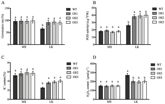 The physiological parameter analysis of wild-type and ApCPX1 transgenic tobacco lines under MS and LK conditions. Note (A) germination rate; (B) POD activity; (C) K+ content; (D) H2O2 content. Values are the mean ± SD (n = 3), and different letters indicate significant differences (p < 0.05) between the treatments. MS indicates MS medium, LK indicates LK medium (containing 10 μm K+).