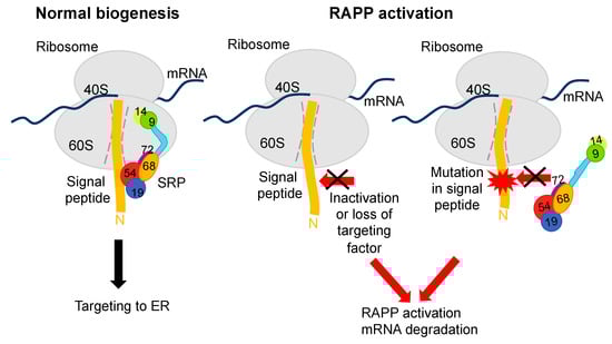 Regulation of Aberrant Protein Production (RAPP) pathway. During normal biogenesis, SRP functions co-translationally as a targeting factor for delivery of secretory proteins into ER. If interactions between signal peptide of the secretory proteins and SRP are disrupted due to inactivation of SRP, loss of targeting factor or mutations in a signal peptide, then RAPP is activated and mRNA of the secretory proteins is degraded [,,]. SRP subunits are labeled by numbers and colors as in Figure 1.