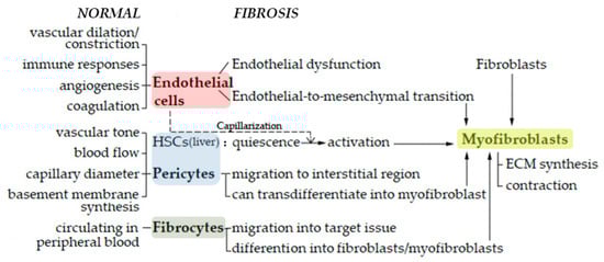 A brief outline of the participation of endothelial cells, pericytes, hepatic stellate cells (HSCs), fibrocytes and myofibroblasts in soft tissue fibrosis, in comparison to their normal roles.