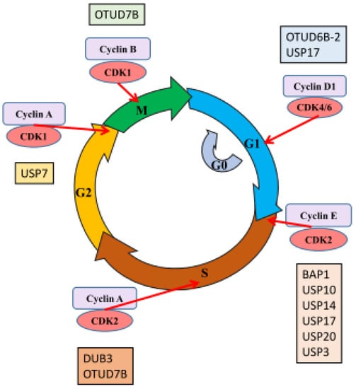 The cell cycle refers to a series of processes, including DNA synthesis, S phase; cell growth, G1 phase; evaluation of the accuracy of the genomic material, G2 phase; and cell division, M phase. The cycle is completed by duplicating the genetic information and equally segregating it into two daughter cells. Many cell cycle checkpoints are controlled by cyclins and cyclin-dependent kinases (CDKs) []. The E3 ligases participate at almost every phase, indicating the importance of ubiquitination and deubiquitination in regulating the cell cycle [,].