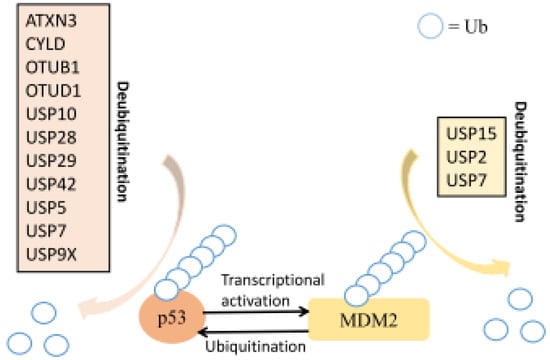 The tumor suppressor p53 is a transcription factor able to control important cellular pathways. It prevents genome mutation and plays protective roles in tumor onset and progression. It is mainly regulated by ubiquitylation, indicating the importance of DUBs in monitoring its ubiquitin cycle []. Both MDM2 and p53 are targeted by different DUBs (Figure 2). Suppression of USP2 leads to MDM2 destabilization and results in p53 activation []. USP7 plays a key role in the p53 pathway by stabilizing both MDM2 and p53 (Figure 2) [,,,,]. Under normal conditions, USP7 has a higher binding affinity to MDM2, the major E3 ligase of p53 [], and thus deubiquitylates MDM2 more efficiently to prevent its self-degradation and maintain stable protein levels for controlling p53 via the UBQ-proteasome pathway []. USP10 regulates p53 localization and stability by deubiquitinating p53. It reverses MDM2-induced p53 nuclear export and degradation []. Moreover, USP29 is reported to cleave poly-ubiqutin chains from p53 and thus stabilize it [], while USP15 stabilizes the E3 UBQ ligase MDM2 in cancer cells and regulates p53 function and cancer cell survival. Inhibition of USP15 induces apoptosis and boosts antitumor T cell responses in tumor cells []. Furthermore, a large number of DUBs have been found to target p53 or p53-associated proteins directly, leading to proliferation. USP5 regulates p53 levels and alters cell growth and cell cycle distribution associated with p21 induction in melanoma cells []. OTUD1 is required for p53 stabilization, and OTUD1 overexpression increases the cleavage of caspase-3 and PARP and subsequently increases apoptosis []. Another p53-associated DUB, otubain 1 (OTUB1), is expressed in high-grade tumor types, such as lung, breast, and ovarian tumors. OTUB1 regulates p53 to promote tumor cell survival and proliferation []. USP42 controls the level of p53 ubiquitination during the early phase of the DDR to promote DNA repair, resulting in the activation of p53-dependent transcription and cell-cycle arrest in response to stress []. In addition, USP28 depletion leads to increased ubiquitinated H2A-K119 and decreased expression of p53, p21, and p16INK4a, suggesting a role for USP28 in cell proliferation via the control of p53 and p53-associated proteins []. Additionally, USP28 deubiquitinates TP53-binding protein 1 to promote p53-mediated transcription []. USP4 is a potential oncogene that inhibits p53 and NF-κB via histone deacetylases 2 (HDAC2) [,]. USP9X-dependent p53 degradation was observed in hepatocellular carcinoma (HCC) cells treated with the small molecule DUB inhibitor WP1130 [].