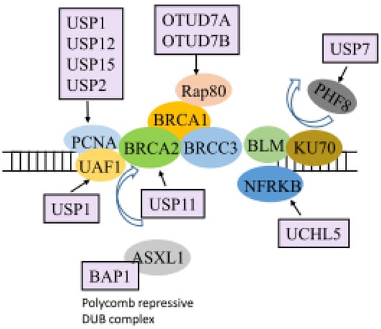 Cells undergo DDR to sense and repair unique lesion structures in the damaged DNA. Efficient DDR protects cells from genomic instability [,]. Ubiquitination regulates DDR by controlling DDR protein localization, activity, and stability []. DUBs play critical roles in different stages of the DDR through the regulation of many molecules involved in DNA repair (Figure 3). DNA repair is important for preventing tumor formation []. Proliferating cell nuclear antigen (PCNA) is a key molecule that mediates the tolerance to DNA damage and allows the growth of tumors. PCNA is monoubiquitinated in response to DNA damage. A fission yeast study showed the importance of UBP2, UBP12, and UBP15 in the stabilization of mono, di, and polyubiquitylated forms of PCNA, which sensitize cells to DNA damage []. In addition, PCNA can be deubiquitinated by USP1 in the crosslink repair pathway in Fanconi anemia [,,]. In a complex with its cofactor UAF1, USP1 reverses PCNA ubiquitination []. UCHL5 regulates double-strand break (DSB) resection and repair by homologous recombination through protecting its interactor, NFRKB, from degradation []. In addition, USP20 plays role in genome maintenance and DNA repair by enhancing recombinational repair of collapsed replication forks []. Furthermore, USP9X regulates the DNA checkpoint protein claspin during S phase, suggesting a role in DNA repair []. USP7-promoted PHF8 stabilization confers cellular resistance to genotoxic insults and is required for the recruitment of BLM and KU70, which are both essential for DNA DSB repair [].
