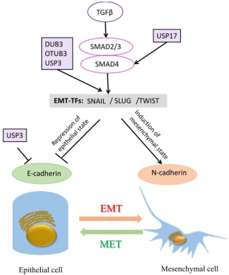 Metastasis, which is the ability of cancer cells spread to different tissues or organs, is regulated by many mechanisms. It is a series of biological processes including various invasion-metastasis cascades. Multiple reports have suggested the role of DUBs in controlling these mechanisms. The epithelial–mesenchymal transition (EMT) represents one of the most important invasive events in cancer metastasis. It refers to a change of a subset of adhesion molecules in cells: adopting a migratory and invasive behavior []. Numerous DUBs are involved in cancer cell invasiveness through the regulation of different EMT transcription factors (Figure 4).