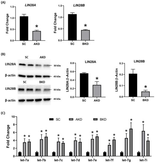 LIN28A or LIN28B knockdown and let-7 miRNAs in day 16 sheep TE. (A) LIN28A and LIN28B mRNA in AKD (n = 5) and BKD (n = 6) day 16 TE compared to SC (n = 6). (B) Representative immunoblots for LIN28A, LIN28B, and β-actin in AKD, BKD, and SC day 16 TE, and densitometric analysis. (C) Let-7 miRNAs in AKD and BKD day 16 TE and SC. * p < 0.05 vs. SC.