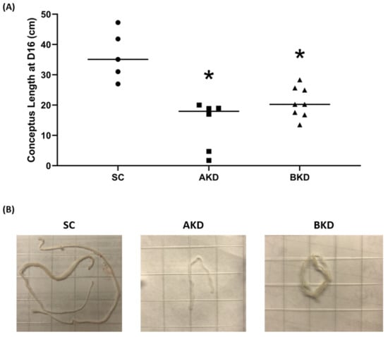 (A) Conceptus length at day 16 after LIN28A knockdown (AKD, n = 6) and LIN28B knockdown (BKD, n = 8) compared to scramble control (SC, n = 5). (B) Representative images of day 16 sheep conceptuses for AKD, BKD, and SC day 16 TE; * p < 0.05 vs. SC.