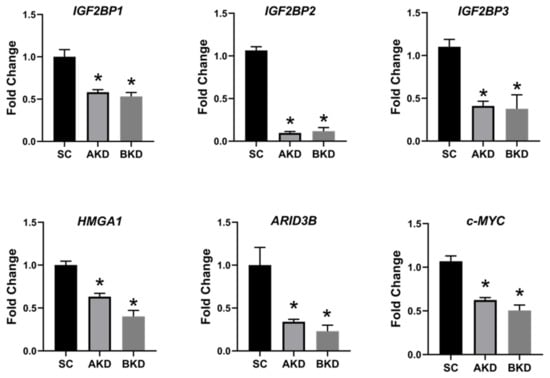 IGF2BP1, IGF2BP2, IGF2BP3, HMGA1, ARID3B, and c-MYC mRNA in AKD and BKD day 16 TE compared to SC (n = 5), * p < 0.05 vs. SC.