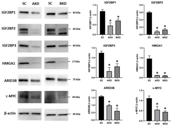 Representative immunoblots for IGF2BP1, IGF2BP2, IGF2BP3, HMGA1, ARID3B, c-MYC, and β-actin, and densitometric analysis of immunoblotting results in AKD and BKD day 16 sheep TE compared to SC (n = 3), * p < 0.05 vs. SC.