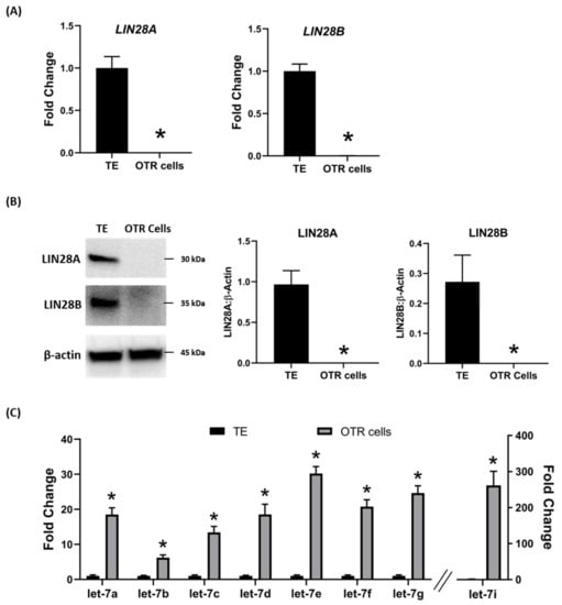 LIN28A, LIN28B, and let-7 miRNAs in non-immortalized ovine trophoblast (OTR) cells. (A) LIN28A and LIN28B mRNA in OTR cells compared to day 16 sheep TE. (B) Representative immunoblots for LIN28A, LIN28B, and β-actin, and densitometric analysis of immunoblotting results in OTR cells compared to day 16 TE. (C) Let-7 miRNAs in OTR cells compared to day 16 TE (n = 3), * p < 0.05 vs. TE.