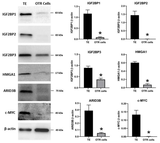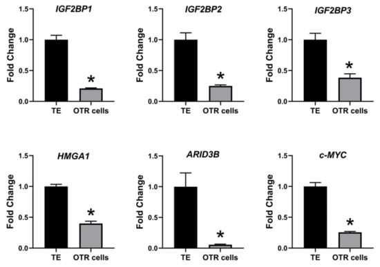 IGF2BP1, IGF2BP2, IGF2BP3, HMGA1, ARID3B, and c-MYC mRNA in OTR cells compared to day 16 TE (n = 3), * p < 0.05 vs. TE.