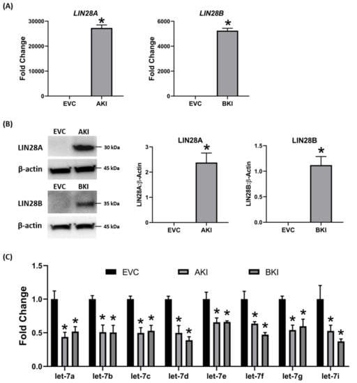 To determine if LIN28 overexpression will rescue the expression of proliferation-associated genes, the iOTR cells were infected with lentiviral particles to generate LIN28A knockin (AKI) or LIN28B knockin (BKI), or lentiviral particles with empty expression vector as expression vector control (EVC). Real-time PCR data showed that AKI iOTR cells had a significant increase in LIN28A mRNA while BKI iOTR cells had a significant increase in LIN28B mRNA compared to EVC (Figure 8A). The densitometric analysis of Western blots showed a significant increase in LIN28A protein in AKI and significant increase in LIN28B protein in BKI iOTR cells compared to EVC (Figure 8B). Moreover, the real-time PCR data showed that let-7 miRNAs (let-7a, let-7b, let-7c, let-7d, let-7e, let-7f, let-7g, let-7i) were significantly reduced in both AKI and BKI iOTR cells compared to EVC (Figure 8C). These results suggest that increased expression of either LIN28A or LIN28B leads to reduction in let-7 miRNAs.