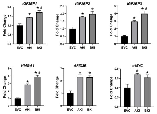 IGF2BP1, IGF2BP2, IGF2BP3, HMGA1, ARID3B, and c-MYC mRNA in AKI and BKI iOTR cells compared to EVC (n = 3), where * p < 0.05 vs. EVC and # p < 0.05 vs AKI.