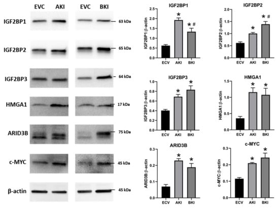 Representative immunoblots for IGF2BP1, IGF2BP2, IGF2BP3, HMGA1, ARID3B, c-MYC, and β-actin, and densitometric analysis of immunoblotting results in AKI and BKI iOTR cells compared to EVC (n = 3), where * p < 0.05 vs. EVC and # p < 0.05 vs AKI.