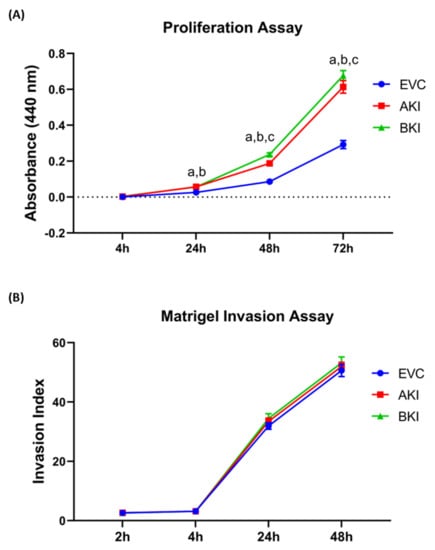 (A) Proliferation of AKI, BKI, and EVC iOTR cells (n = 4/treatment) was measured after 4 h, 24 h, 48 h, and 72 h using Quick Cell Proliferation Assay Kit. (B) Invasion of AKI, BKI, and EVC iOTR cells (n = 4) measured after 2 h, 4 h, 24 h, and 48 h using the Matrigel Invasion Assay Kit; where a, p < 0.05 for AKI vs. EVC; b, p < 0.05 for BKI vs. EVC; and c, p < 0.05 for BKI vs. AKI.