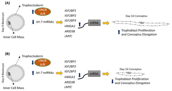 LIN28 is a part of a complex genetic pathway known to regulate multiple downstream targets []. Inhibition of biogenesis of mature let-7 miRNAs is one of the main pathways through which LIN28 regulates the expression of its downstream targets [,]. Let-7 miRNAs reduce expression of many genes by degrading their mRNAs or inhibiting translation []. Our results show that RNAi of LIN28A or LIN28B and resultant increase in let-7 miRNAs in day 16 TE significantly reduced IGF2BP1, IGF2BP2, IGF2BP3, HMGA1, ARID3B, and c-MYC. Previous studies have shown the role of IGF2BP1, IGF2BP2, IGF2BP3, HMGA1, ARID3B, and c-MYC in cell proliferation [,,,,,,,,], suggesting that reduced proliferation of trophoblast cells after LIN28A or LIN28B knockdown in TE is due to reduced expression of proliferation-associated genes (Figure 12).