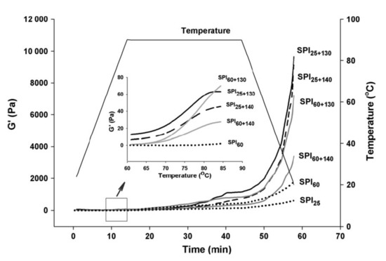Typical curves of elastic modulus (G′) of soy protein isolate subjected to isothermal and two-stage heating processes plotted against temperature (heating, holding and cooling). The subscript values of 25, 60, 130 and 140 denote heating temperatures (°C) with a holding time of 1 h at 25 and 60 °C (LT), or 4 s at 130 and 140 °C (UHT). The inset magnifies the onset of gelation with rising temperature (with permission from Jian et al. [8]).