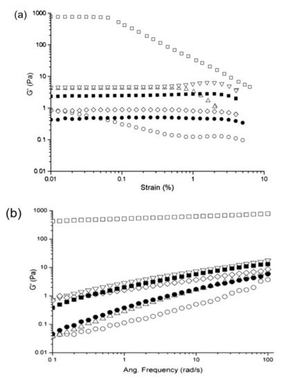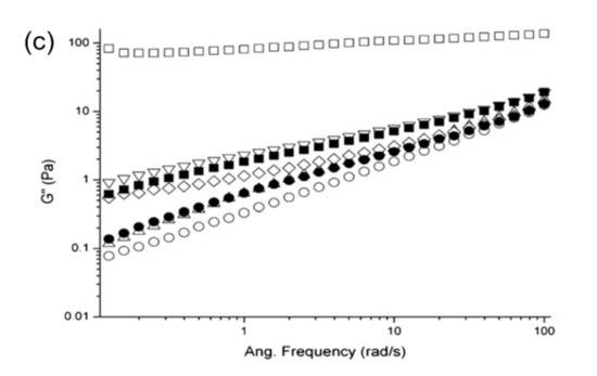 (a) Strain sweep, (b) elastic modulus (G′), and (c) loss modulus (G″) of a 12.5% soy protein dispersion having different ultrasonic treatment of no ultrasound (□); 200W for 15 min (◯); 200W for 30 min (△); 400 W for 15 min (▽); 400 W for 30 min (◇); 600 W for 15 min (■); and 600 W for 30 min (●) (with permission from Hu et al. [77]).