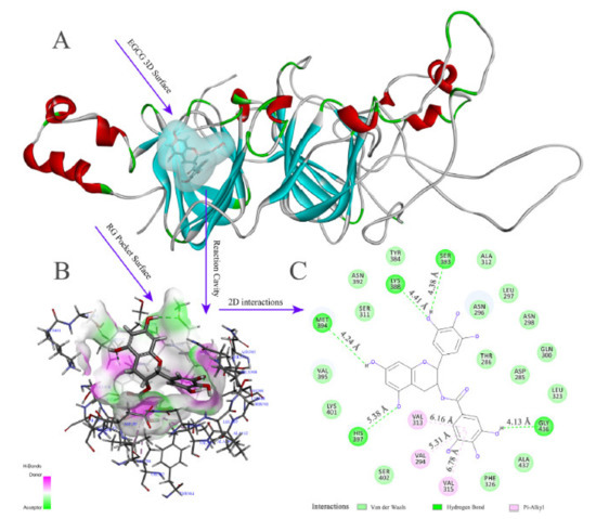(A) Three-dimensional (3D) docking model of rice glutelin (RG)-EGCG interaction simulated by Discovery Studio 3.0 (Accelrys Inc., USA), (B) The hydrogen bond surface of protein receptor interacting with EGCG, the blue and green colors represent the donor and acceptor of hydrogen bonds, respectively, and (C) Two-dimensional (2D) schematic interaction diagram between EGCG and RG, the color of amino acid residues is drawn by interaction (with permission from Xu et al. [90]).