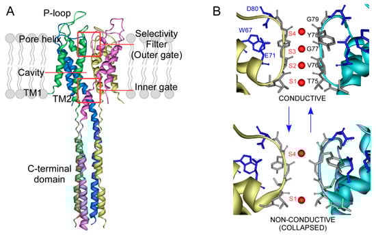 Our knowledge on these proteins has increased exponentially in the last decades since the atomic structure of a few ion channels has been solved, mainly through X-ray crystallography and nuclear magnetic resonance (NMR) spectroscopy. KcsA, a potassium channel from the Streptomyces lividans bacteria, was the first ion channel whose atomic structure was solved [4,5,6]. This fact, the relative ease to purify it in relative large amounts, and its endurance to experimental conditions have made KcsA the main model to study the structure/function relationships in ion channels. This protein is formed by four identical subunits arranged around a central aqueous pore through which ions flow. Each subunit comprises cytosolic N-terminal and C-terminal domains and two α-helical transmembrane segments (TM1 and TM2). Between the two transmembrane segments there is a short, tilted helix spanning inward to about one-third of the membrane thickness and oriented towards the centre of the tetramer, followed by a stretch of amino acids containing the consensus sequence 75TVGYG79, known as the selectivity filter (SF). This is the narrowest part of the protein pore and, as its name reveals, is highly selective to define which kind of ions can pass through it. Thus, it allows K+ permeation, while preventing the physiologically relevant Na+ from flowing through the pore. Below it, an aqueous vestibule forms, shaped by the TM2 segments. There, ions are fully hydrated and become partly stabilized near the inner mouth of the narrower selectivity filter by the four dipolar pore helices, which point their negatively charged C-terminal ends toward the hydrated ions (Figure 1A). However, residues lining this cavity exhibit a low affinity by surrounding ions and only modestly discriminate between Na+ and K+.