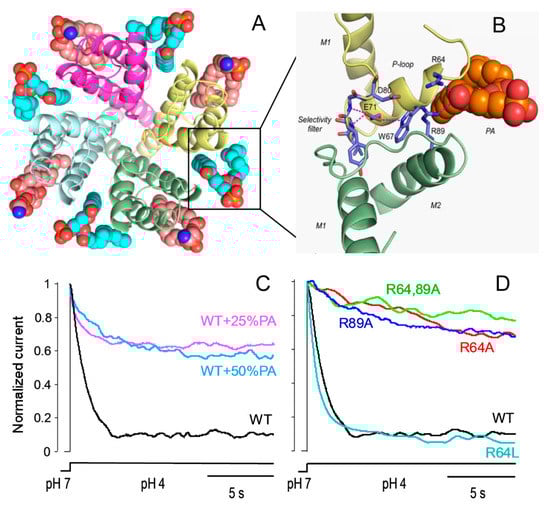 Lipid modulation of KcsA inactivation by binding of non-annular anionic lipids. In (A), a top view molecular model of KcsA with annular (acyl chains in light pink) and non-annular (acyl chains in cyan) lipids is shown. In (B), a zoom of a non-annular lipid binding site is depicted, with a PA molecule bound. In (C,D), normalized KcsA macroscopic currents elicited by pH jumps (pH 7 to 4) are shown. (C) The influence of anionic phospholipid on KcsA inactivation. K+ currents were recorded from macropatches of WT KcsA reconstituted in plain asolectin lipids (WT), asolectin lipids with an added 25% of egg PA (WT + 25% PA) or asolectin lipids with an added 50% of egg PA (WT + 50% PA). (D) Effects of R64A, R64L, R89A and R64,89A KcsA mutations on channel inactivation upon reconstitution in plain asolectin lipids. The holding potential was set to +150 mV in all these experiments.