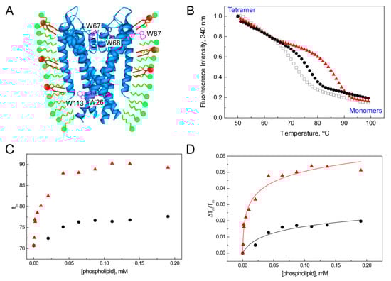 In order to explore the role of different phospholipids as effectors on the WT KcsA channel structure and stability, our group introduced a thermal denaturation assay performed in a detergent-phospholipid mixed micelles system (e.g., small amounts of lipids solubilized in excess of dodecyl β-D-maltoside (DDM) detergent micelles containing the protein) (Figure 3A). The main advantage of using the mixed-micelle system is to dissect a specific effect of a lipid in a bilayer-free environment, excluding the effects of the membrane properties, such as the thickness and lateral pressure. The thermal denaturation assay monitors the changes in the intrinsic fluorescence of WT KcsA as the temperature increases at a constant rate, which leads to the irreversible dissociation (and partial unfolding) of the tetrameric KcsA into its constituent monomers [32] (Figure 3B). The fluorescence signal results from the average emission of five Trp residues per monomer (see location at Figure 3A). The midpoint temperature of dissociation (Tm) can be determined from the sigmoidal thermal denaturation curves by fitting the data to a two-state unfolding model, assuming a linear dependence of the pre and post transition baselines on temperature: