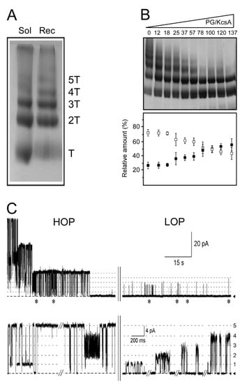 In direct relation to the main scope of this review, the effects of anionic phospholipids on the assembly/disassembly of channel clusters seem to correlate with the appearance of different patterns of channel activity. Two main patterns of activity have been detected by patch-clamp recordings of excised, inside-out membrane patches of purified KcsA reconstituted into giant liposomes made from asolectin phospholipids: (i) a low opening probability (LOP) pattern in which channel openings are scarce and result primarily from single channel events or from occasional coupled gating of a few channels, and (ii) a high opening probability (HOP) pattern in which the channels are opened most of the time and exhibit positive cooperativity through coupled gating of a large number of channels (Figure 4C). The details on the ion conduction features in HOP and LOP patterns from KcsA reconstituted in the asolectin liposomes have been given previously [81]. The appearance of either one of these different opening probability patterns is dependent on the conditions and protein concentrations used for reconstitution of the channel protein, which reconciles the apparent discrepancies on the different levels of conductance of KcsA reported by other groups [89,90,91,92]. In essence, experiments in which the concentration of anionic phospholipids in the reconstituted liposomes is changed by adding these phospholipids into the reconstitution media suggest that the more complex HOP recordings indeed arise from large channel clusters, which are favored at low concentration of anionic lipids, whereas LOP recordings originate mostly from non-clustered, phospholipid-bound KcsA channels [88].
