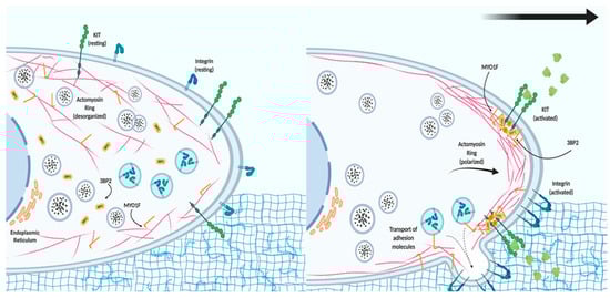 The role of MYO1F in mast cell migration. In resting conditions, mast cells express tyrosine-protein kinase KIT receptor and different integrins on the cell membrane. The actin cytoskeleton and MYO1F are distributed along the cell membrane and in the cytoplasm, whereas Src homology 3 domain (SH3)-binding protein 2 (3BP2) is mostly found in the cytoplasm. Activation of the KIT receptor initiates actin remodeling, which generates the leading edge (consisting of actin filaments) necessary for cell movement. MYO1F is necessary for the secretion and localization of activated integrin molecules that will induce adhesion to the extracellular matrix and aid cell migration.