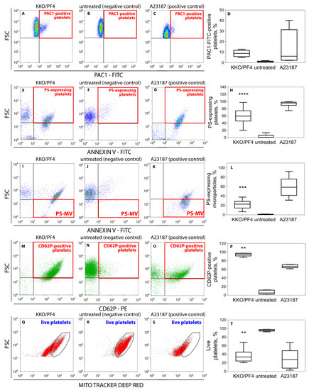 Representative dot-plots and averaged results of platelet flow cytometry under various experimental conditions. (A–D) Expression of the active integrin αIIbβ3 on the surface of platelets determined with PAC1-FITC-Abs. (E–L) Expression of phosphatidylserine on the surface of platelets (E–H) and platelet microvesicles (I–L) labeled with Annexin V-FITC. (M–P) Expression of P-selectin (CD62P) on platelets labeled with anti-CD62P-PE-Abs. (Q–T) Fractions of live platelets (gated CD41-positive particles) with normal mitochondrial membrane potential (ΔΨm) determined with a ΔΨm-sensitive dye MitoTracker Deep Red. Platelets were incubated for 60 min without (negative control) or with a mixture of KKO (pathogenic monoclonal anti-PF4/heparin Ab) (50 μg/mL KKO) and PF4 (10 μg/mL) or 10 μM calcium ionophore (positive control). Red squares indicate the quadrants and black circles (Q–S) indicate the gates with quantified signals. Each experiment was performed with platelets isolated from at least three independent donors. ** p < 0.01, *** p < 0.001, **** p < 0.0001 compared to a corresponding negative control (Kruskal–Wallis test with Dunn’s post-hoc test).