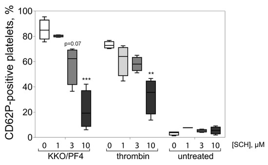 Inhibitory effect of SCH 79797, a selective antagonist of PAR1 receptors, on platelet activation induced by the combination of KKO and PF4. Platelets were pre-incubated for 30 min at 37 °C with SCH 79797 at 0, 1, 3, and 10 μM followed by treatment for 60 min at 37 °C with KKO/PF4 (10 and 50 µg/mL, respectively), 1 U/mL thrombin (positive control), and without any treatment (untreated, negative control). Platelet activation was assessed by the expression of P-selectin, determined using flow cytometry with fluorescently labeled anti-CD62P-Abs. Each experiment was performed with platelets isolated from three independent donors. ** p < 0.01, *** p < 0.001 compared to a corresponding control without addition of SCH 79797 (2-way ANOVA test with Dunn’s post-hoc test).