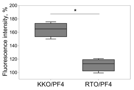 Fluorimetric analysis of calpain activity in platelets that were incubated for 180 min with a mixture of 10 μg/mL PF4 + 50 μg/mL KKO or RTO. The numbers that characterize the calpain activity were normalized by the corresponding negative control (untreated platelets) taken as 100%. Experiments were performed with platelets isolated from seven independent donors. * p < 0.05 (Mann–Whitney U test).