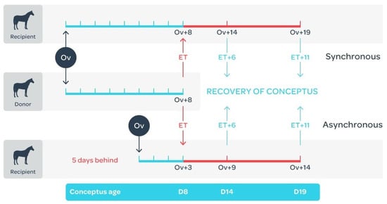 - Wilsher, S.; Clutton-Brock, A.; Allen, W.R. Successful transfer of day 10 horse embryos: Influence of donor-recipient asynchrony on embryo development. Reproduction 2010, 139, 575–585. [Google Scholar] [CrossRef][Green Version]