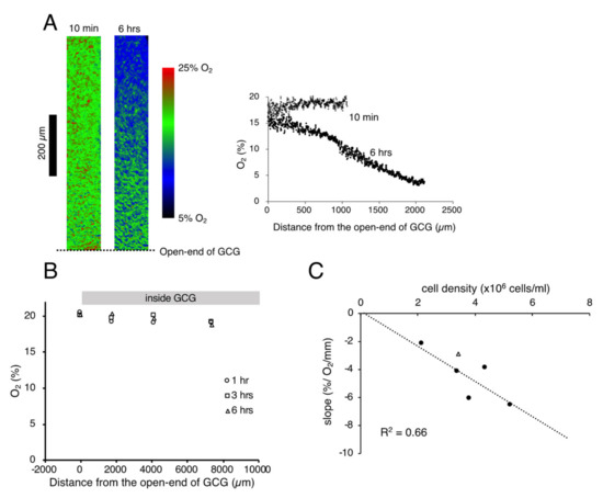 We successfully visualized the oxygen concentration gradient under GCG. As shown in Figure 1A, immediately after placing the GCG, the oxygen concentration along the oxygen diffusion path was constant up to 1200 µm inside the GCG. Subsequently, the oxygen concentration gradients developed slowly and, at six hours after placement of the GCG, a −6.5% O2/mm linear gradient was established under GCG. The oxygen concentration gradient abolished after treatment with a mitochondrial respiratory complex III inhibitor (antimycin A, 2 µM), indicating that the oxygen concentration gradient depends upon mitochondrial respiration (Figure 1B). Magnitude of the oxygen concentration gradient increased in proportion to the number of cells per unit volume (Figure 1C). In our culture conditions, 100% confluence corresponded to the cell density of ~5.5 × 106 cells/mL and, therefore, the largest magnitude of the oxygen concentration gradient attainable in our GCG system was ~6% O2/mm. It is notable that the oxygen concentration at the entrance of the GCG was substantially lower than the air level. This indicates the presence of an oxygen diffusion barrier in the extracellular medium as suggested previously by Metzen et al. [14].