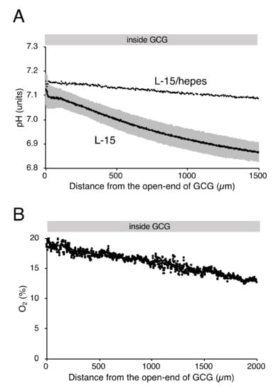 As reported elsewhere [12], extracellular pH gradients along the diffusion path slowly developed in GCG and reached the steady state in three hours. Gradients of pH with a magnitude of 0.2–0.3 units/mm were consistently demonstrated (Figure 2A). Supplementing hepes into the L-15 medium abolished the pH gradient (Figure 2A). On the other hand, the addition of hepes in L-15 medium did not affect oxygen concentration gradients under GCG (Figure 2B and the open triangle in Figure 1C).