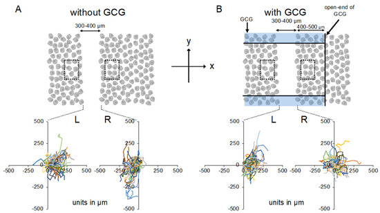 Trajectories of MDA-MB-231 cells measured for 24 h. The oxygen concentration in the microincubator was 21% (room air). Values presented in the graphs are in micrometers. (A) Without the GCG placed, cells migrated into the wound space equally from the right (R) and left (L) boundaries of the wound space. (B) With the GCG placed, the migration of the cells initially located at the right boundary (R) into the wound space was hindered and they even appeared to migrate in a direction opposite to that toward the wound space as if they were crawling into the crowd of cells. Trajectories of the 50 cells are superimposed. To assess the rate of cell proliferation under GCG, 300 × 500 µm rectangular regions of interest (ROIs) were defined close to but outside the wound space (dashed squares) and the number of cells in the respective ROI was counted and compared at time = 0 and time = 24 h.