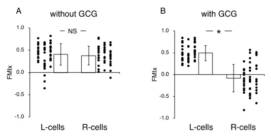 Forward migration index (FMI) parallel to the diffusion path (FMIx) without (A) and with the GCG in place (B). Without the GCG involved, the FMIx values for the L-cells and R-cells were not different (NS, p = 0.60). In contrast, with the GCG in place, the FMIx value for the R-cells was significantly smaller compared to that of the L-cells. Data were accumulated from five independent experiments in which 10 cells were sampled in each experiment. Error bars represent the SD. *, p < 0.05, as judged by Student’s t-test.
