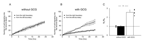The number of cells that migrated into the wound space in 24 h. (A) Without the GCG, the numbers of cells migrating into the wound space from the left boundary and the right boundary were the same. (B) With the GCG, the numbers of cells migrating into the wound space from the left boundary and the right boundary were different, with a statistically significant difference demonstrated after five hours. (C) The ratio of the numbers of cells migrating into the wound space from the left boundary and the right boundary determined at 24 h (NL and NR, respectively). The directional migration of MDA-MB-231 cells was clearly demonstrated with involvement of the GCG. Error bars represent the SD. Data were accumulated from five independent experiments. *, p < 0.05, as judged by Student’s t-test.