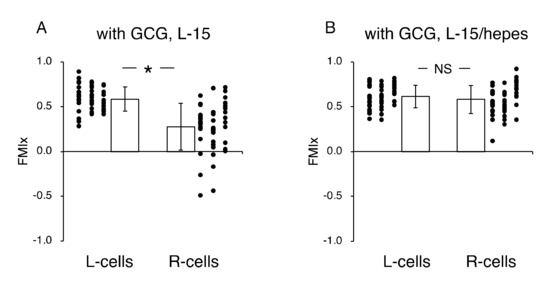 Next, we undertook another series of experiments in which the role of extracellular pH gradients in directional movements of MDA-MB-231 cells was examined. We completed five “L-15” and five “L-15/hepes” experiments, respectively. Figure 6 illustrates the analysis of the directionality of cell migration. With the GCG in place, the magnitude of the FMI for the R-cells was significantly smaller than that for the L-cells in L-15 medium (Figure 6A), while FMI values for the L-cells and R-cells were not different from one another in the L-15/hepes medium (Figure 6B).