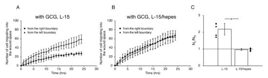 The number of cells that migrated into the wound space in 24 h. (A) In L-15 medium, NL and NR were different, consistent with what is observable in Figure 5B. (B) Conversely, in L-15/hepes medium, NL and NR were the same. (C) The heterogeneity in cell migration ultimately disappeared in L-15/hepes medium. Error bars represent the SD. Data were accumulated from five independent experiments. *, p < 0.05, as judged by Student’s t-test.
